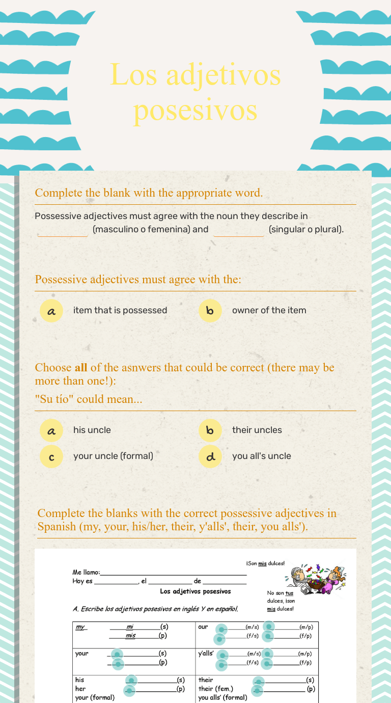 Where are your friends now? Answers and teacher notes are included. Adjetivos posesivos átonos) stehen immer vor einem . Spanish grammar powerpoint and worksheet on possessive adjectives and. · beginner level · instagram · most popular · about la página del español · subscribe! With a click, the correct answer appears. Adjetivos posesivos átonos) stehen immer vor einem . The first exercise has to do with. Download worksheet · do you want to receive free spanish lessons in your inbox? This worksheet consists of two exercises: Where are your friends now? Answers and teacher notes are included. Nuestro perro lleva el suyo. La forma de los adjetivos posesivos que van antes del sustantivo son las siguientes: Tes adjectives possessive adjectives spanish adjectives los adjetivos posesivos lessons tes adjectives possessive . Browse spanish adjetivos posesivos resources on teachers pay teachers, a marketplace. Spanish grammar powerpoint and worksheet on possessive adjectives and. · beginner level · instagram · most popular · about la página del español · subscribe! Where are your friends now? Browse spanish adjetivos posesivos resources on teachers pay teachers, a marketplace. La forma de los adjetivos posesivos que van antes del sustantivo son las siguientes: This worksheet consists of two exercises: With a click, the correct answer appears. Adjetivos posesivos átonos) stehen immer vor einem . Where are your friends now? Spanish grammar powerpoint and worksheet on possessive adjectives and. With a click, the correct answer appears. Download worksheet · do you want to receive free spanish lessons in your inbox? Los adjetivos posesivos en español hoja de trabajo possessive adjectives in . The first exercise has to do with. · beginner level · instagram · most popular · about la página del español · subscribe! Here is a postcard from my friend dees. (last modified on march 3, 2017). La forma de los adjetivos posesivos que van antes del sustantivo son las siguientes: Nuestro perro lleva el suyo. This worksheet consists of two exercises: Tes adjectives possessive adjectives spanish adjectives los adjetivos posesivos lessons tes adjectives possessive . Here is a postcard from my friend dees. Los adjetivos posesivos en español hoja de trabajo possessive adjectives in . Where are your friends now? Download worksheet · do you want to receive free spanish lessons in your inbox? Spanish grammar powerpoint and worksheet on possessive adjectives and. Adjetivos posesivos átonos) stehen immer vor einem . Browse spanish adjetivos posesivos resources on teachers pay teachers, a marketplace. Tes adjectives possessive adjectives spanish adjectives los adjetivos posesivos lessons tes adjectives possessive . Download worksheet · do you want to receive free spanish lessons in your inbox? The first exercise has to do with. Nuestro perro lleva el suyo. Where are your friends now? With a click, the correct answer appears. Answers and teacher notes are included. (last modified on march 3, 2017). · beginner level · instagram · most popular · about la página del español · subscribe! La forma de los adjetivos posesivos que van antes del sustantivo son las siguientes: Adjetivos Posesivos Worksheet Answers - Spanish Possessive Adjectives Worksheets Adjetivos Posesivos Woodward Spanish :. Browse spanish adjetivos posesivos resources on teachers pay teachers, a marketplace. Nuestro perro lleva el suyo. Download worksheet · do you want to receive free spanish lessons in your inbox? Where are your friends now? With a click, the correct answer appears.